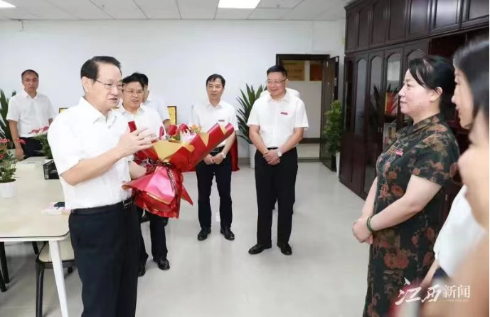 期間,省委書記、省人大常委會主任易煉紅看望慰問了我校教師,并強調全省廣大教師深入學習貫徹習近平總書記關于教育的重要論述,始終牢記為黨育人、為國育才的光榮使命,不忘立德樹人初心,積極投身教育改革,辦好人民滿意的教育,爭當黨和人民滿意的“四有”好老師,為培養德智體美勞全面發展的社會主義建設者和接班人貢獻力量。在全省首屆思政名師郭莉工作室,易煉紅認真察看教研成果,詢問大家講好思政課的心得體會,并指出,講好思政課不容易,關鍵要堅持用習近平新時代中國特色社會主義思想培根鑄魂、啟智潤心,善用身邊的鮮活資源,把道理講深、講透、講準、講活,真正抓住學生心理、觸及學生心靈,有效引導學生真學、真懂、真信、真用。易煉紅為郭莉等教師送上鮮花和節日祝福,勉勵她們堅持不懈推動思政課改革創新,不斷增強思政課的思想性、理論性、針對性和親和力,全面提升高校思政建設水平。