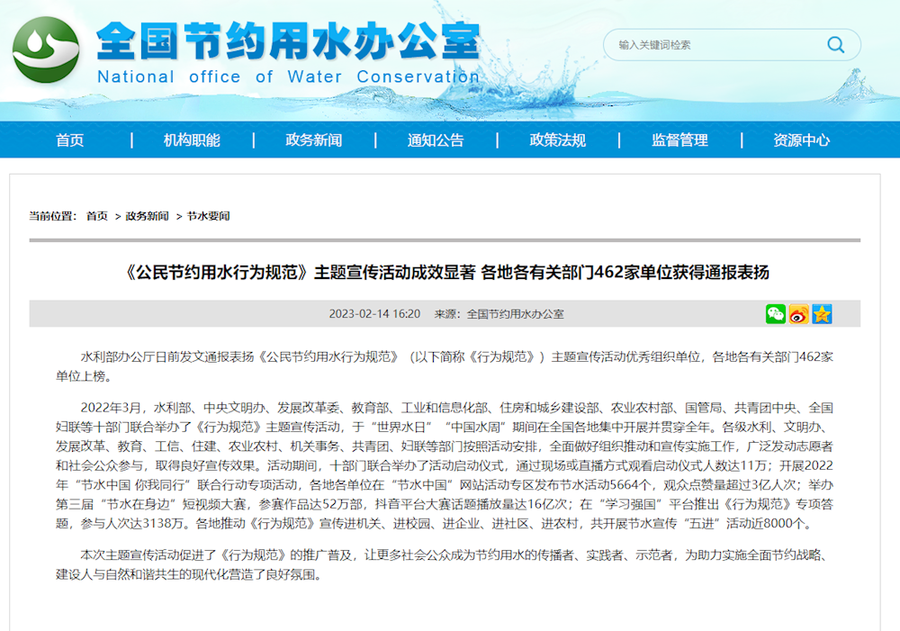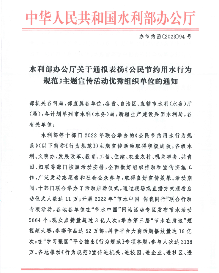 啟航網(wǎng)訊 2月7日,中華人民共和國(guó)水利部辦公廳發(fā)文,通報(bào)表?yè)P(yáng)《公民節(jié)約用水行為規(guī)范》主題宣傳活動(dòng)優(yōu)秀組織單位。在獲評(píng)的全國(guó)462家單位中,我校為10所高校之一。