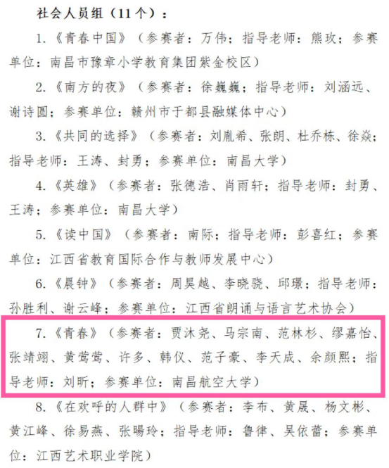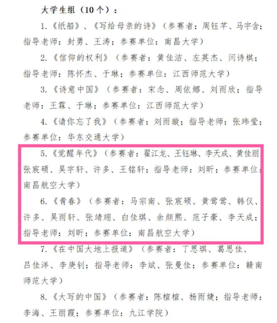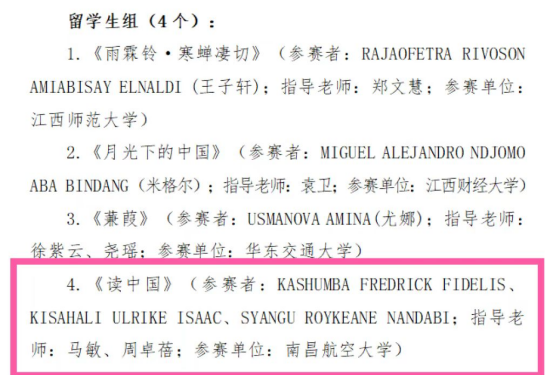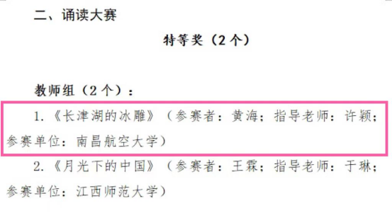 啟航網訊 近日,省教育廳公布了江西省第四屆中華經典誦寫講大賽獲獎名單和作品。我校黃海老師的《長津湖的冰雕》獲教師組特等獎;翟江龍等同學的《覺醒年代》、馬宗南等同學的《青春》獲大學生組二等獎;賈沐堯等同學的《青春》獲社會人員組二等獎;KASHUMBA FREDRICK FIDELIS等人的《讀中國》獲留學生組三等獎,我校獲得本次比賽“優(yōu)秀組織獎”。