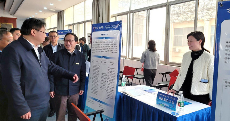 在人才對接活動中,江西省委組織部副部長、省人大常委會選任聯工委主任、省委人才辦主任劉光華,江西省人社廳黨組成員、副廳長王成兵等領導來到我校展位現場調研指導學校高層次人才引進工作。