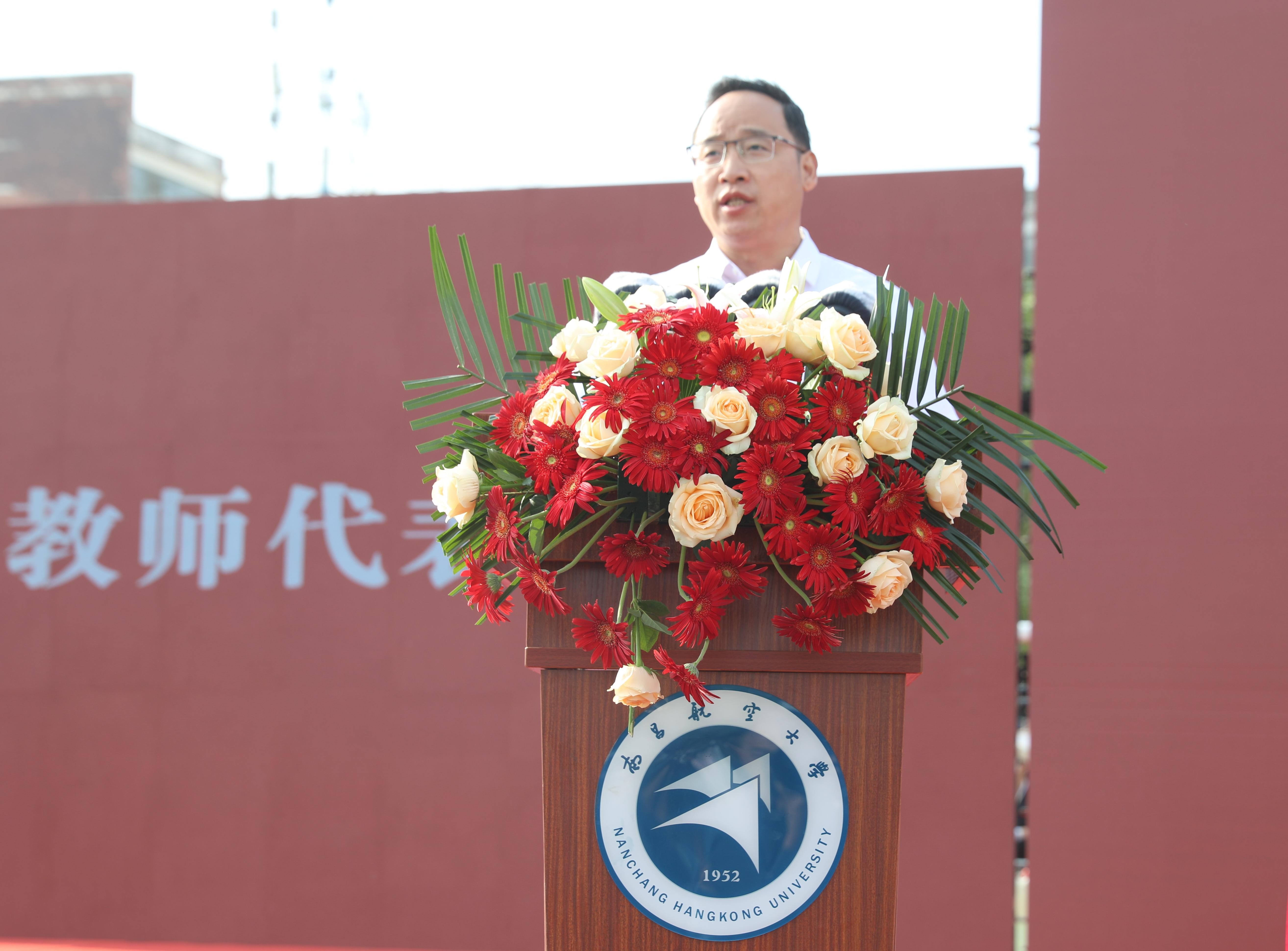 江西省贛鄱俊才—高層次高技能領軍人才、江西省百人遠航工程人選李秋鋒教授,作為教師代表,表達了對新生的殷切期望,希望同學們不忘老師的諄諄教導,做一個心懷國家、勇挑重擔、執著追求、求實創新、大氣包容、品格高雅的青年人,將大學時光與國家、學校和自己的前途命運聯系起來,讓青春之光照亮奮進之路,努力成就最美好的未來。