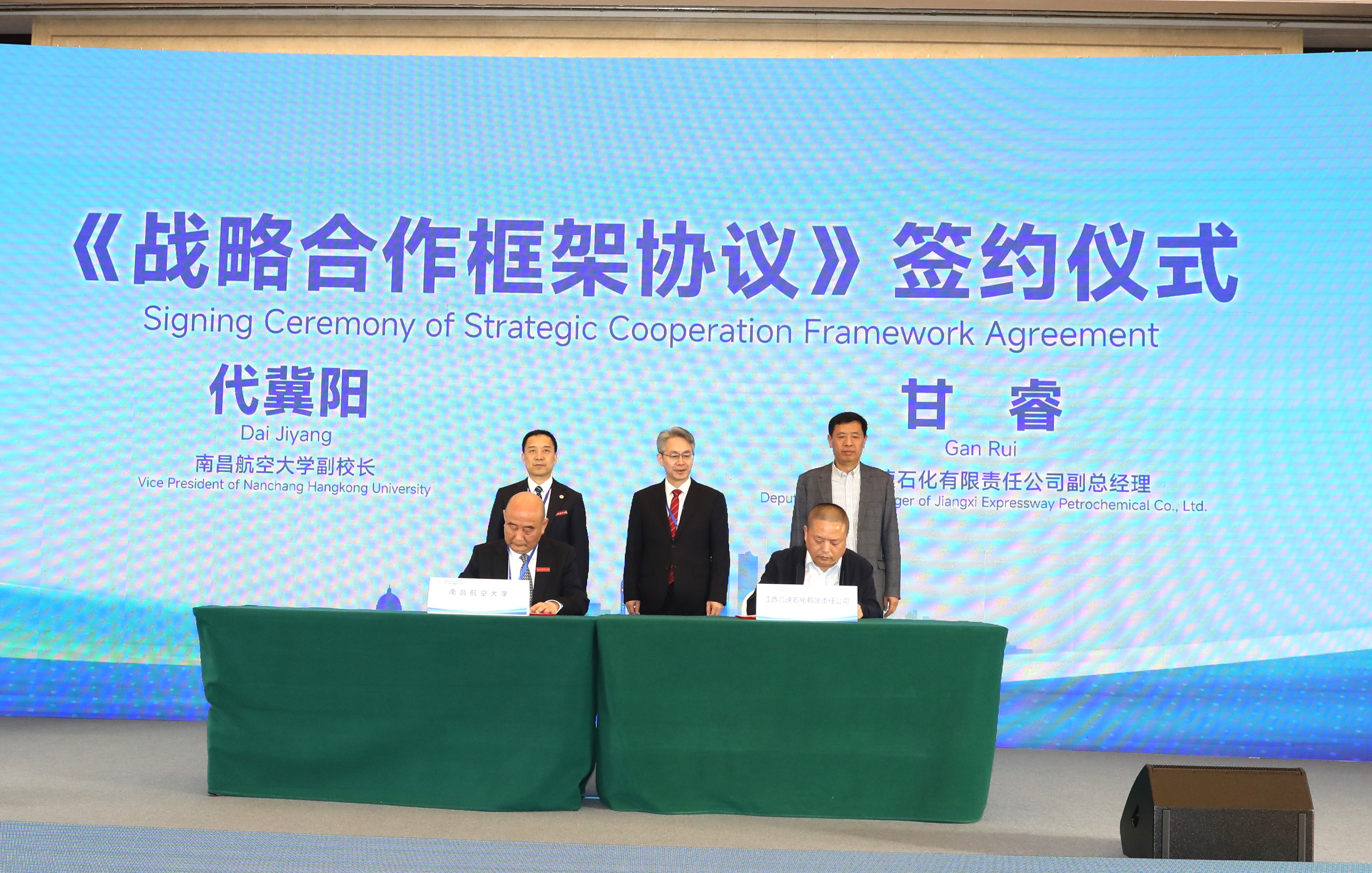 在江西省教育廳二級巡視員雷杰華,我校黨委書記李德平,我校黨委副書記、校長盧超,江西高速石化有限責任公司黨委書記、董事長陳大學的共同見證下,我校黨委常委、副校長代冀陽與江西高速石化有限責任公司黨委委員、副總經(jīng)理甘睿共同簽署了《戰(zhàn)略合作框架協(xié)議》。該協(xié)議的簽署標志著雙方在產(chǎn)學研用合作方面邁出了實質(zhì)性的一步,將共同推動雙方在科技創(chuàng)新、人才培養(yǎng)、產(chǎn)業(yè)發(fā)展等方面的深入合作。