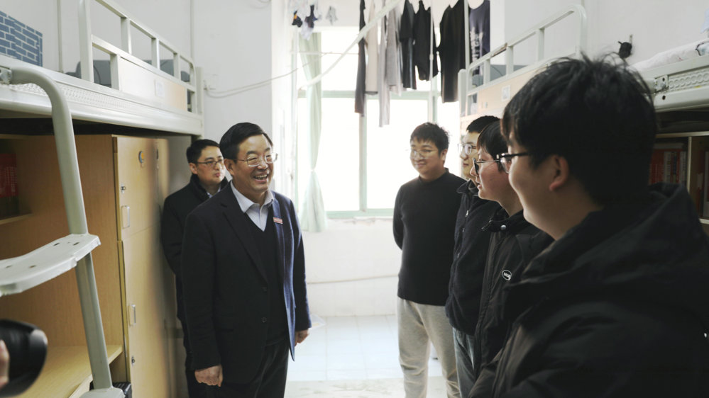 在隨機走訪學生宿舍的過程中,李德平與大四學生深入探討職業選擇,勉勵大家“將個人理想融入強國建設浪潮之中”。在與大一學生交流時,他叮囑同學們要重視數學等基礎學科的學習,并勉勵大家樹立遠大抱負,努力學習專業知識,為未來的職業生涯奠定堅實基礎。針對調研中反映出的職業生涯規劃需求,李德平現場開展工作部署,強調學生工作部門要做好頂層設計,積極引導各學院聯合引進名校及行業內專家,為學生提供更加精準、有效的職業指導和實習就業機會。