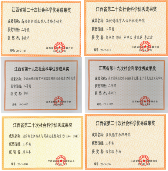 學院擁有馬克思主義理論一級學科碩士點,現有馬克思主義社會發展理論與實踐、紅色文化與當代思想政治教育、馬克思主義中國化與制度創新、中國近現代經濟社會發展研究四個主要研究方向。學院圍繞高校思想政治理論課改革創新和哲學人文社會科學開展研究,科研水平不斷攀升,研究特色逐漸凸顯。2021年以來,學院先后獲批江西省高校本科高質量教學團隊1個、江西省“毛澤東思想與中國特色社會主義理論體系概論”課教學改革創新團隊1個;獲得國家社科基金項目7項(思政專項2項,其中重點項目1項),教育部人文社會科學研究一般項目1項,省社會科學規劃課題22項(其中重大項目1項,重點項目10項),省高校人文社科項目2項,省黨建課題2項(其中重點項目1項),省教改課題8項(其中重點項目4項),省教育規劃課題6項(其中重點項目2項);獲省社科優秀成果二等獎4項、三等獎2項。