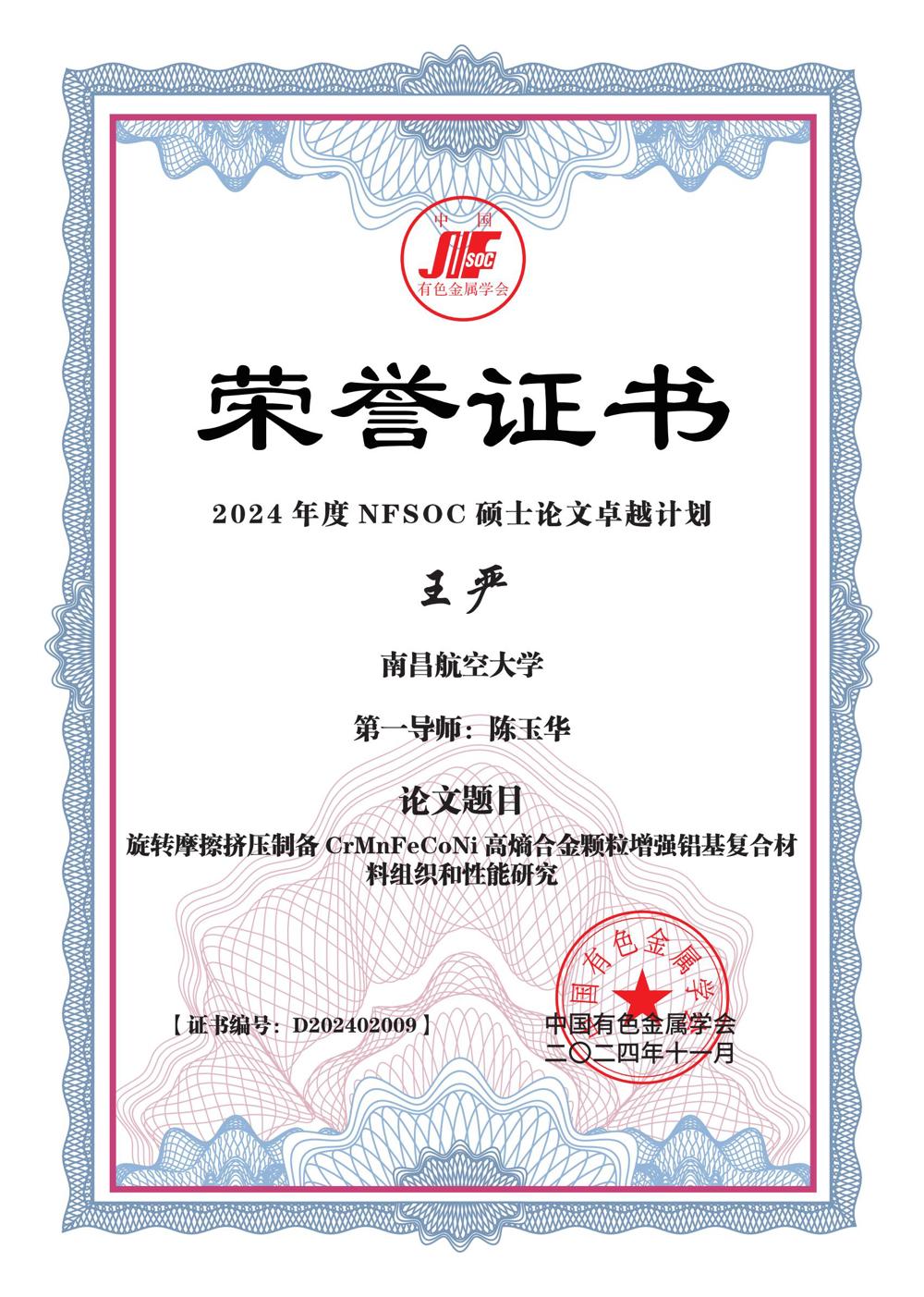 啟航網訊 近日,中國有色金屬學會公布了“2024年度NFSOC碩博論文卓越計劃”獲選通知,我校材料科學與工程學院碩士研究生王嚴的碩士學位論文——《旋轉摩擦擠壓制備CrMnFeCoNi高熵合金顆粒增強鋁基復合材料組織和性能研究》入選。