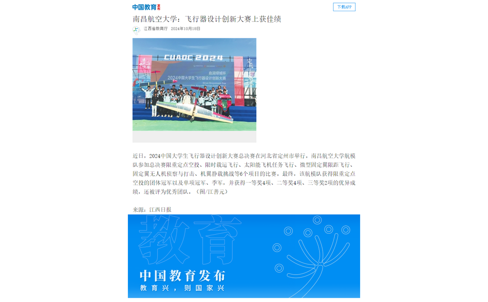 您的位置: 首頁 >新聞中心>媒體南航>詳細內容 媒體南航 《中國教育發布》:南昌航空大學:飛行器設計創新大賽上獲佳績 來源: 作者: 攝影: 發布時間:2024-10-18 瀏覽次數: 次 【字體:小 大】 啟航網訊:10月18日,《中國教育發布》報道我校:南昌航空大學:飛行器設計創新大賽上獲佳績媒體鏈接:http://fx.xwapp.moe.gov.cn/article/202410/6711d1c45eb9ce3753e33460.html 責任編輯:李夢遙 【打印正文】