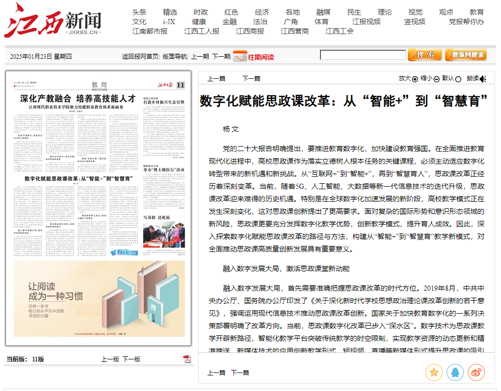 啟航網訊:1月23日,江西日報11版刊登《數字化賦能思政課改革:從“智能+”到“智慧育”》一文,報道我校。