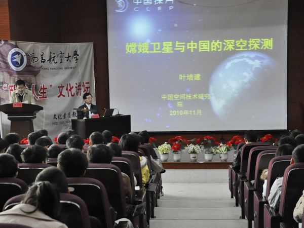 啟航網訊 11月25日上午,“嫦娥一號”總設計師葉培建院士做客“臥龍人生”文化講壇,在昌航逸夫樓學術報告廳做了一場題為《嫦娥衛星與中國深空探測》的報告會。本次講座由校黨政辦、科技處、文化素質教育中心共同主辦,講座由高益慶副校長主持。