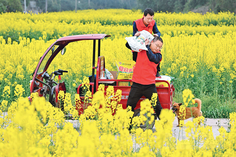 春耕備耕時節,各地組織黨員干部走進田間地頭,切實幫助農戶解決實際困難。圖為2025年3月20日,四川省眉山市仁壽縣彰加鎮鏵爐村,黨員干部正在為缺少勞力的農戶送化肥和種子。人民圖片 彭雅靈/攝